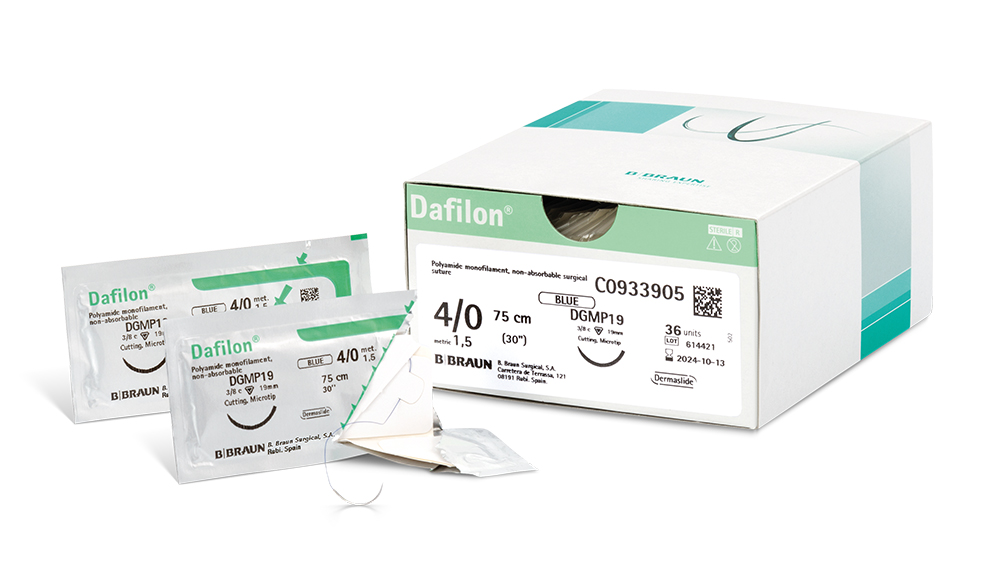 Das Nahtmaterial Dafilon® von B. Braun ist ein monofiles und nicht resorbierbares Nahtmaterial. Das Nahtmaterial wird in verschiedenen Größen, Fadenstärken und Fadenlängen geliefert. Der Faden ist aus synthetischem Material (Polyamid). Hautnähte sollten grundsätzlich immer mit einem synthetischen und monofilen Nahtmaterial durchgeführt werden, da dieses Material keine negative Dochtwirkung hat.