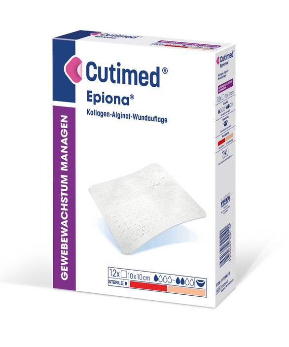 essity Cutimed® Epiona® ist ein resorbierbarer Wundverband, der aus 90 % nativem Rinder-Kollagen und 10 % Kalziumalginat besteht. Das native Kollagen besitzt eine 3D-Matrixstruktur, die dem Aufbau der menschlichen Dermis ähnelt. Dadurch übernimmt es die Funktionen des defekten Kollagens in chronischen Wunden, fördert das Zellwachstum und unterstützt das Einwandern von Fibroblasten. Zusätzlich bindet Cutimed® Epiona® schädliche Faktoren wie Matrix-Metalloproteinasen (MMPs), die den Heilungsprozess stören können, und schützt somit die körpereigenen Wachstumsfaktoren und das Kollagengerüst.