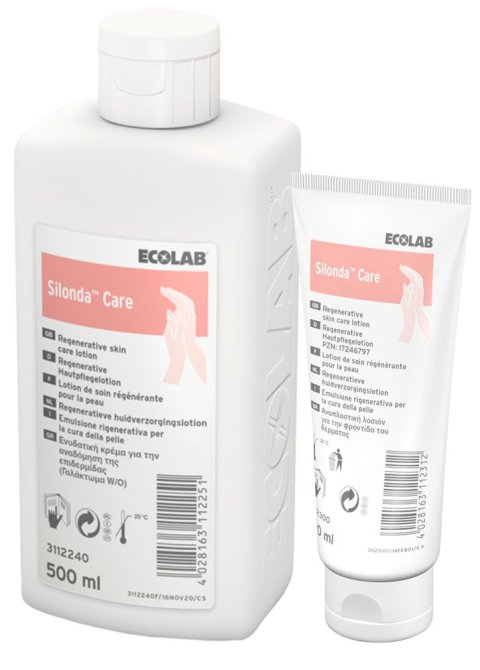 Die Wasser-in-Öl-Emulsion Silonda™ Care von Ecolab regeniert beanspruchte Haut einfach bei der täglichen Anwendung. Dazu wurden hochwertige Inhaltsstoffe einzigartig kombiniert. Unter anderem enthält die Hautpflege Glycerin, welches eine feuchtigkeitsspendende Wirkung hat. Zum Schutz der Haut ist auch Vitamin E enthalten. Bei Wasser-in-Öl-Emulsionen (W/O) ist der Anteil an pflegenden Fetten und Ölen höher, als bei einer Öl-in-Wasser-Emulsion. Die Hautpflege ist dermatologisch getestet.