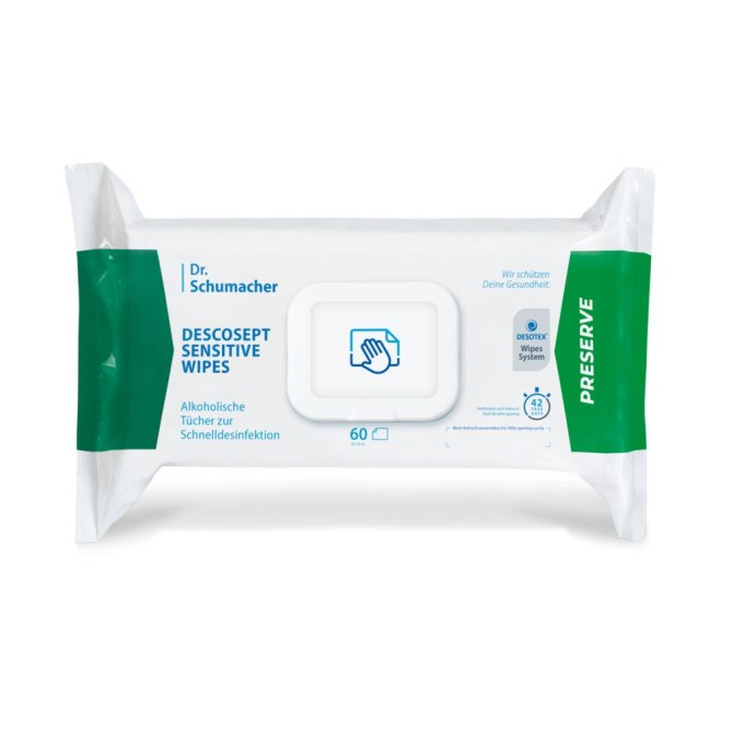 Mit den DESCOSEPT SENSITIVE WIPES von Dr. Schumacher lassen sich schnell und einfach mittelgroße Flächen im patientennahen Bereich reinigen und desinfizieren. Dank der praktischen Packung lassen sich die Tücher leicht entnehmen und sind sofort einsatzbereit.