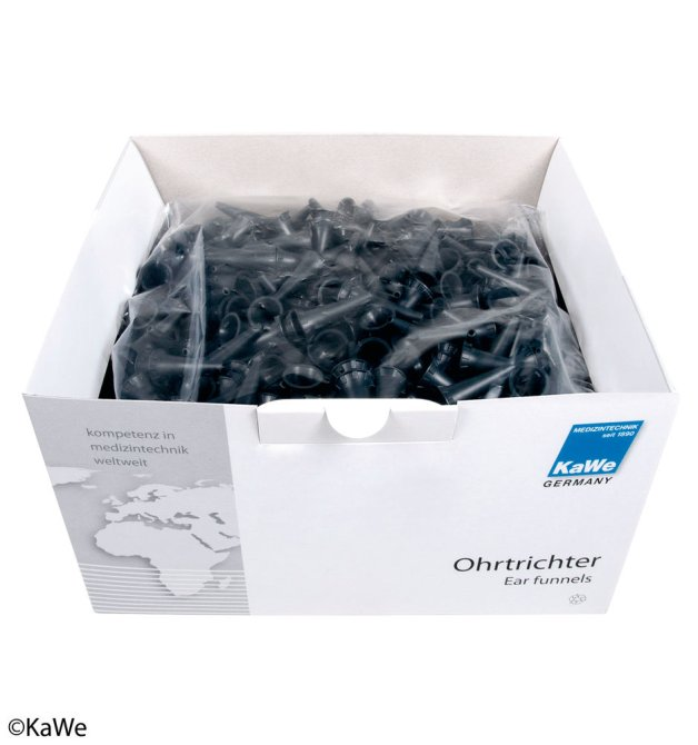 Die KaWe Einmal-Ohrtrichter aus Kunststoff sind geschüttete oder gestreckt verpackte, schwarze Ohrtrichter für den hygienischen Einmalgebrauch bei der Untersuchung des Patienten. Die Trichter haften fest und präzise am Instrument.