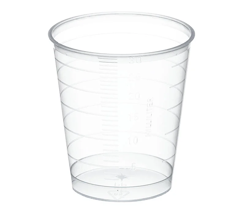 Diese farblosen Einnahmegläschen aus Kunststoff vereinfachen die Einnahme von Medikamenten. Diese Dosierbecher haben ein Volumen von 30 ml und sind sehr flexibel. Die Einnahmegläschen werden in einem Beutel mit 75 Stück geliefert. Optional kann man die passenden Deckel dazu bestellen.